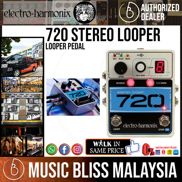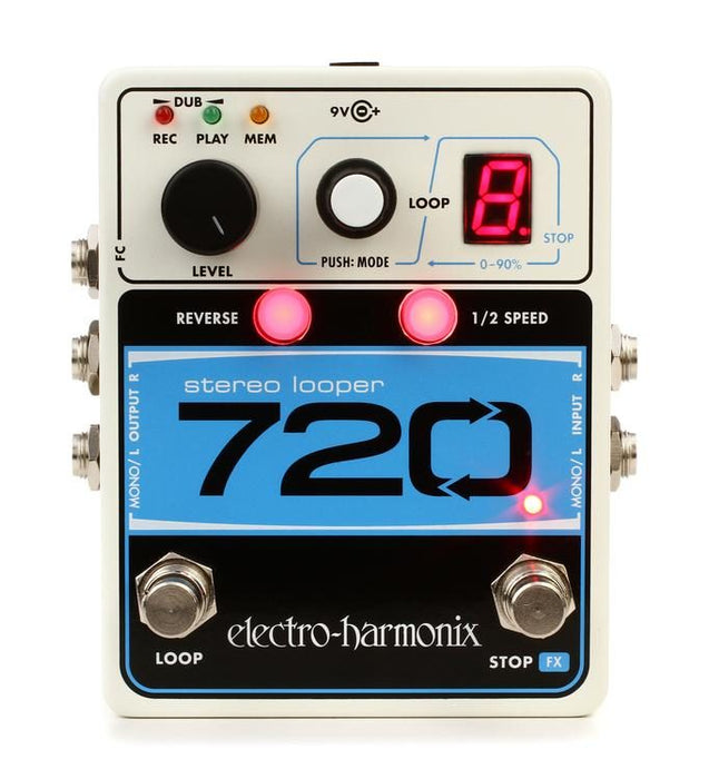 The Electro-Harmonix 720 Stereo Looper pedal is a great addition to your pedalboard when you need a feature-rich looper in a convenient, compact package. You'll enjoy 10 independent loops with up to 12 minutes of high-quality performance and unlimited overdubbing. Two footswitches, with an output jack for adding an optional 3-button controller, deliver hands-free operation. And 1/2 speed and reverse features encourage further sonic experimentation. The Electro-Harmonix 720 Stereo Looper pedal puts much of the power of their larger loopers into a compact and pedalboard-friendly design.