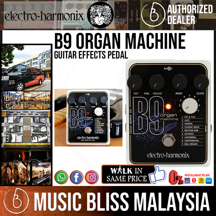Rarely have we seen such an instantly likable guitar effects pedal at Music Bliss as the electro-harmonix B9 Organ Machine. Not only does this pedal transform your guitar tone into one of nine classic organ tones with jaw-dropping realism, it performs like a champ. We're talking about zero tracking problems, glitches, mistriggers, or false notes. What's more, each setting has an appropriate modulation effect built in, such as rotary speaker, tremolo, or vibrato, and you can add in organ percussion or key click sounds with a dedicated control. Top it off with two great ways you can blend in your dry guitar signal, and it's no wonder the ehx B9 Organ Machine has become an instant classic.
