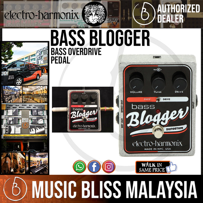 The Electro-Harmonix Bass Blogger gives bassists cutting fuzz tones and great overdrive tones - in the same pedal! E-H knows a thing or two about fuzz and overdrive - their legendary Muffs have been the standard for fuzz since their inception - and they package all their distortion expertise into the Bass Blogger. Controls for Drive, Volume, and Tone let you craft your ideal distortion style and a direct output lets you feed a second amp or effects chain. Add great distortion tones to your bass rig with the Bass Blogger!