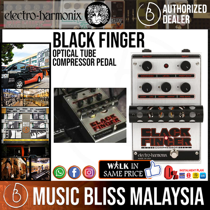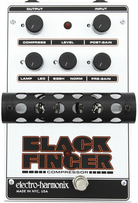 E-H's Black Finger employs the same compression techniques as many of the legendary high-end compressors that now populate the vintage gear market. Unlike many of the other "tube" products on the market that frequently under-deliver voltages from 9 volts to 50 volts to the circuit, Black Finger employs a toroidal transformer with a full 300 volts of tube-glowing power for optimal performance. For sonic variety, there are LED and lamp light sources to act as compression triggers, and Black Finger delivers musical sustain/compression for guitar or bass.
