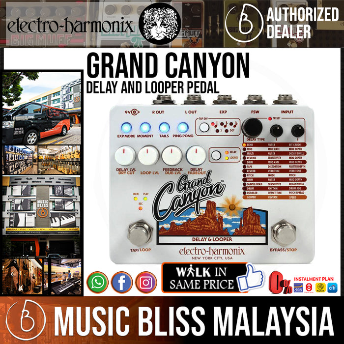 With 12 effects types plus a full-featured looper section, the Electro-Harmonix Grand Canyon delay and looper pedal is one of the most comprehensive and creative delay pedals you could put on your pedalboard. Effects range from vibrant delays and echos to animated pitch effects, reverbs, sample/hold, and more. The looper provides up to 16 minutes of recording, and your looped audio remains until you clear it — even after you turn the Grand Canyon off. For more delay effects and looping capabilities than you could ever ask for, check out the Electro-Harmonix Grand Canyon delay and looper pedal.
