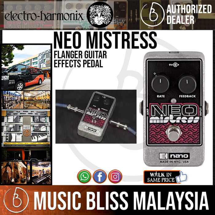 Longing for lush, full-bodied flanging effects? Here's the pedal for you: the Electro-Harmonix Neo Mistress flanger guitar effects pedal. Just like the classic Mistress, the Neo Mistress delivers varied tonal density and ultra-smooth sweeping flange effects. The Neo Mistress also features a manual filter matrix mode, which freezes the filter sweep so that you can take control of it. The Neo Mistress also includes a feedback control, which allows you to contour the effect to taste. Add one of these attractively affordable pedals to your rig and open up a world of cool modulated effects.