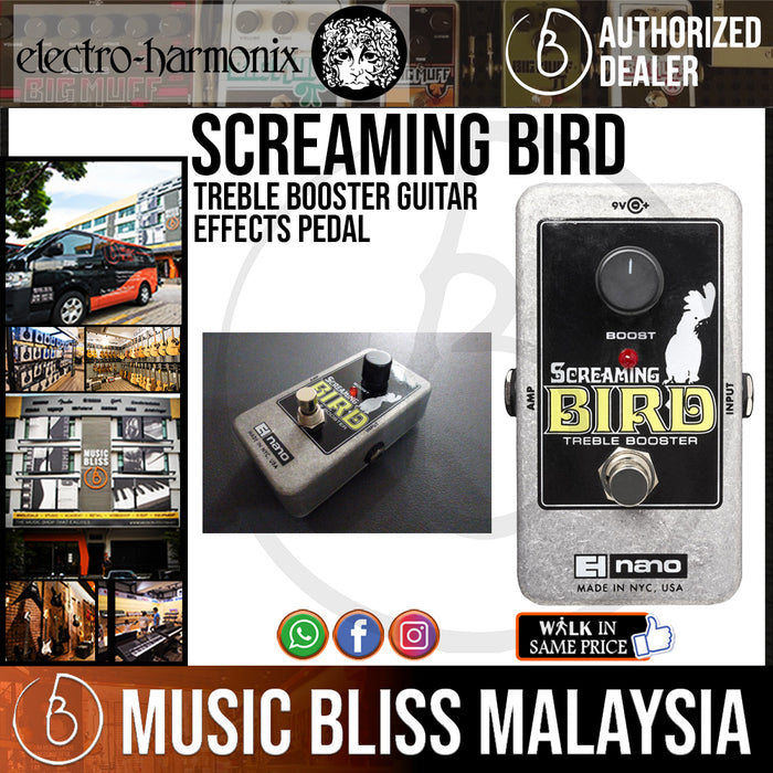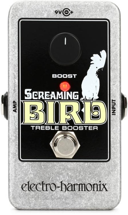 Hit your favorite amplifier with the Electro-Harmonix Screaming Bird treble booster, and you'll be able to cut through any mix on any stage. The Screaming Bird boasts up to 20dB of high-frequency boost, and you can vary the center frequency between 1.6kHz and 2.4kHz. Dial in just the right amount of bite to be heard, or crank it to overdrive your tube amp. No matter how you use it, you won't be ignored when you kick on the Electro-Harmonix Screaming Bird treble booster.
