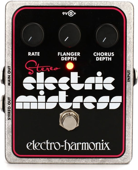 The Electro-Harmonix Stereo Electric Mistress pedal takes an E-H classic to even more mind-blowing levels! The Stereo Electric Mistress lets you manually flange your signal, or freeze the modulated sound in Filter Matrix Mode. You can achieve some truly incredible modulations using the Flanger and Chorus controls together. Controls include Rate, Flanger Depth, and Chorus Depth. Now you can tweak away and get some of the coolest tones ever produced from a pedal with the Stereo Electric Mistress!