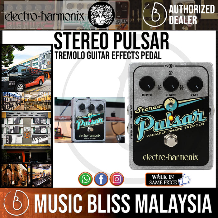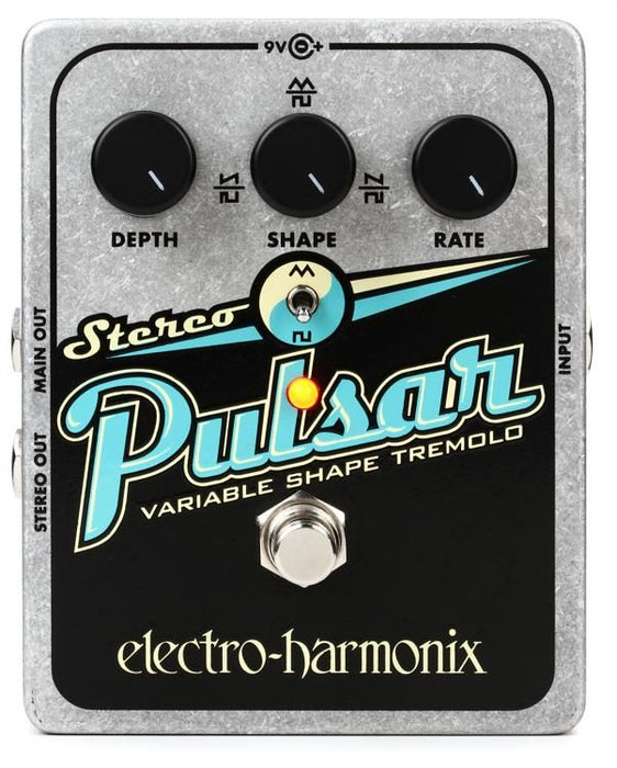 The Electro-Harmonix Stereo Pulsar delivers beautiful vintage vibrato, destined to cascade your tone to new sonic heights! Expect undulating tremolo and panning that's perfect to fill out and add dimension to your sound both on stage, and in the studio. A switch lets you select between vintage triangle or square waves so you can sculpt the right sound for each song - plus, you can shape control transitions from negative to positive saw tooth, and even adjust the pulse width for the ultimate in sonic control. If you're looking to add motion and depth to your sound, there's just nothing like stereo tremolo - and with the build-quality and sonic finesse we've come to expect from Electro-Harmonix, you can't go wrong with the Stereo Pulsar.
