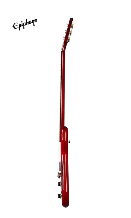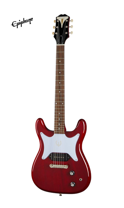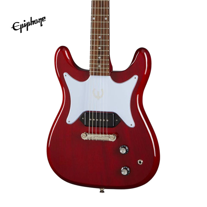 First introduced in 1958, the Epiphone Coronet is one of Epiphone's first and most successful original solid body electric guitar designs. The latest version brings back many of the features of the early Coronet models including the symmetrical double-cutaway mahogany body with a single Epiphone PRO™ P-90 Dogear pickup, three on a side reduced sized Kalamazoo headstock with Epiphone Bikini badge and ivory button tuning machines, and a white butterfly pickguard with foil E logo. The Epiphone Coronet comes equipped with a glued-in mahogany neck with a medium C profile, Indian laurel fretboard with 12" radius and 22 medium jumbo frets, 1 volume and 1 tone control with CTS® potentiometers, and an Epiphone Lightning Bar compensated wraparound bridge.