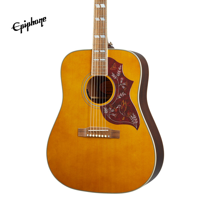 The Hummingbird™ is one of the most instantly-recognizable and remarkable acoustic guitars ever built. The new Epiphone Inspired by Gibson™ Hummingbird blends solid woods, vintage appointments, and a Fishman® Sonicore under-saddle pickup and Sonitone preamp. Outfitted with gold Epiphone Deluxe tuners, top and back multi-ply binding, Kalamazoo style headstock, and a bone nut and saddle, it's available in Aged Antique Natural Gloss and Aged Heritage Cherry Sunburst Gloss finishes. An optional hardshell or EpiLite™ case is available separately. A battery is not included. To power your pickup, you will need a 9-volt battery.