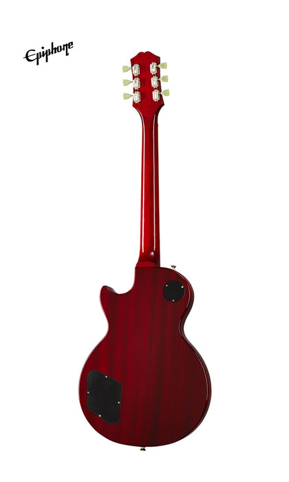 Epiphone’s new Inspired by Gibson™ Collection proudly presents the Les Paul™ Standard 50s! This guitar lovingly recreates the feel and tone of the 1950s era Les Pauls. Epiphone’s long friendship with Mr. Les Paul began in 1940 when Les built one of the world’s first solidbody electric guitars while working nights at the original Epiphone factory in Manhattan. Les’ first solidbody guitar, nicknamed “the Log”, would go on to inspire the Les Paul Standard, which many consider the greatest electric guitar ever made. The guitar is crafted with a mahogany body, maple cap (AAA veneer on figured tops), bound 50s shaped mahogany neck with long neck tenon, Indian laurel fingerboard with classic trapezoid inlays, Epiphone's new Vintage Deluxe tuners, a pair of critically acclaimed Epiphone ProBucker™ humbuckers™, and gold Top Hat knobs with dial pointers. Available in Metallic Gold,  Vintage Sunburst, and Heritage Cherry Sunburst full-gloss finishes. This Epiphone Inspired by Gibson Original model also has the Kalamazoo headstock, rolled neck for a comfortable feel, Graph Tech® NuBone® nut, era-appropriate wiring, and CTS® pots. Optional hardshell or EpiLite™ case is available.
