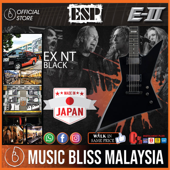 Formerly called “ESP Standard”, all ESP E-II instruments are created at our ESP factory in Tokyo, Japan, and are designed for professional players who accept no compromises in tone, feel, or reliability for their guitars and basses. The E-II EX NT is a killer guitar with a bold and angular design for musicians who like to make a statement from the moment they pull their guitar from the case. Available in Black and Snow White finishes, it features set-thru construction of a mahogany body and mahogany neck with ebony fingerboard, 22 extra-jumbo frets, and a satin finish on the back for super smooth playability. The E-II EX NT includes premier-quality components like a bone nut, Gotoh locking tuners, a Gotoh TOM bridge and tailpiece, and Dunlop locking strap buttons, along with a set of EMG 60 and EMG 81 pickups in Brushed Black Chrome.
