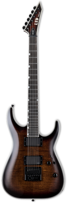 NOTE: Due to ongoing challenges in the global supply chain, instruments purchased from ShopESP that are not currently in stock may take an extended time frame to be delivered. LTD Deluxe guitars are designed to offer the tone, feel, looks, and quality that working professional musicians require in an instrument, while remaining affordable enough for serious players. The LTD MH-1000 EverTune Dark Brown Sunburst is an outstanding instrument with a mahogany body and flamed maple top, and multi-binding on the body and matching-finish headstock. Its Macassar ebony fingerboard has 24 extra-jumbo stainless steel frets. This MH-1000 model features the EverTune constant tension bridge, keeping your guitar in tune at all points of the fingerboard in nearly any environment. Other components include Grover tuners, and a set of EMG 60TW-R and EMG 81 active pickups, with a push-pull control to split the neck pickup.