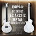 The LTD Arctic Metal Series takes the same design theme of our Black Metal Series and flips the color scheme from the darkest of blacks to the coldest of frozen wastelands. Comparable in build quality to our LTD Deluxe “1000 Series”, Arctic Metal instruments feature a Snow White Satin finish, a single premium-quality pickup with matching white cover, and Macassar ebony fingerboards with no inlays and glow-in-the-dark side markers. The EC Arctic Metal is based on the popular single-cutaway ESP Eclipse shape. It offers set-thru construction for smooth access to the highest frets at 24.75” scale, an aggressive EMG 81TW pickup with black logo, a single volume knob with push-pull control to split the pickup, and 24 extra-jumbo stainless steel frets.