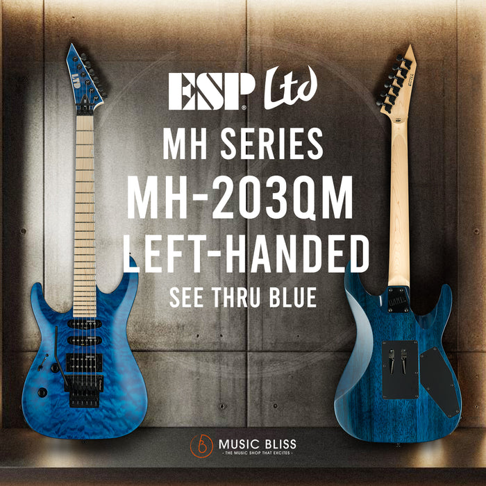 The MH-203QM offers the arched top of the ESP Horizon with the aggressive styling elements of the M Series, all wrapped in an affordable high-quality instrument, and adds a quilted maple top in See Thru Blue finish. It offers the versatile H/S/S (humbucker/single coil/single coil) pickup configuration, making it great for many genres of music. The MH-203QM features bolt-on construction of a mahogany body with a maple neck and maple fingerboard with 24 extra-jumbo frets, and includes an LTD by Floyd Rose tremolo.