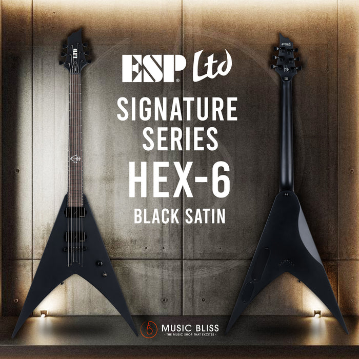 For the past 30+ years, Nergal has been the lead guitarist, vocalist, and mastermind behind Polish metal warriors Behemoth. While continuing to evolve musically, the unique darkness of Behemoth’s songs and sounds have been a constant presence in their influential recordings and extraordinary live shows. For the first time ever offered in an LTD version, the Nergal Signature Series HEX-6 offers a purely diabolical symmetrical V-shaped body, built with neck-thru-body construction at 25.5” scale. The HEX-6 features a mahogany body and three-piece maple neck, all with an appropriately evil Black Satin finish. Its Macassar ebony fingerboard has 24 extra-jumbo frets, and is devoid of markers with the exception of a special 12th fret inlay that draws artistically from the band’s Opvs Contra Natvram album. Black chrome hardware components on the HEX-6 include a TonePros locking TOM bridge with string-thru-body, LTD locking tuners, and a set of direct-mount Fishman Fluence Modern Humbucker active pickups, with the alnico version in the neck position and ceramic version in the bridge. These innovative pickups offer multiple voices that are selectable with a push-pull volume control.