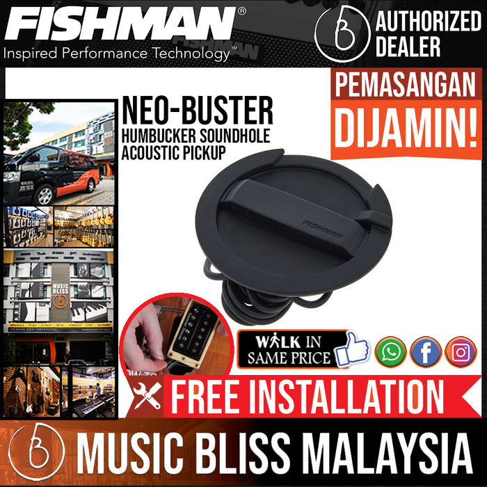 Amplify your guitar and fight feedback at the same time with the Fishman Neo-Buster magnetic soundhole pickup and feedback buster. This innovative product combines a feedback-fighting soundhole cover with Fishman's passive Neo-D single-coil pickup. Fishman uses a state-of-the-art magnetic field/coil structure on the Neo-D (similar to their acclaimed Rare Earth pickup), and its string balance is excellent, thanks to the unique arrangement of its neodymium magnets. Take it from Music Bliss - the Neo-Buster will give you years of great performance. Installation is easy. Just place the Neo-Buster into your guitar's soundhole, plug into your amp or mixer, and play. Give your acoustic guitar a new amplified and feedback-free life with the Fishman Neo-Buster magnetic soundhole pickup and feedback buster.