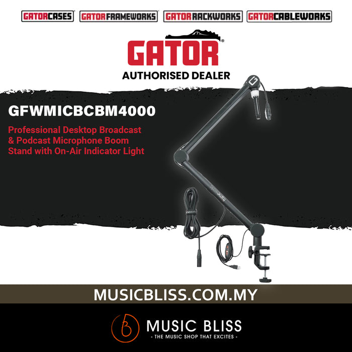 Desktop podcasters and broadcasters or anyone looking to record vocals from the comfort of their studio chair will love the GFW-MICBCBM4000 Deluxe Desk-mounted Broadcast Microphone Boom Arm from Gator Frameworks. This boom arm mounts easily and quickly to your desk or table and features a spring-loaded, reticulating arm that rotates a full 360 degrees, letting you position and reposition your mic to that ideal placement for optimal performance. Multiple angle knobs are also featured for additional adjustment options. This versatile boom also comes with an on-air light indicator, so you know when you are “live” a feature that impressed us here at Music Bliss. Thanks to an internally guided USB power cable, the on-air light will stay powered, too.
