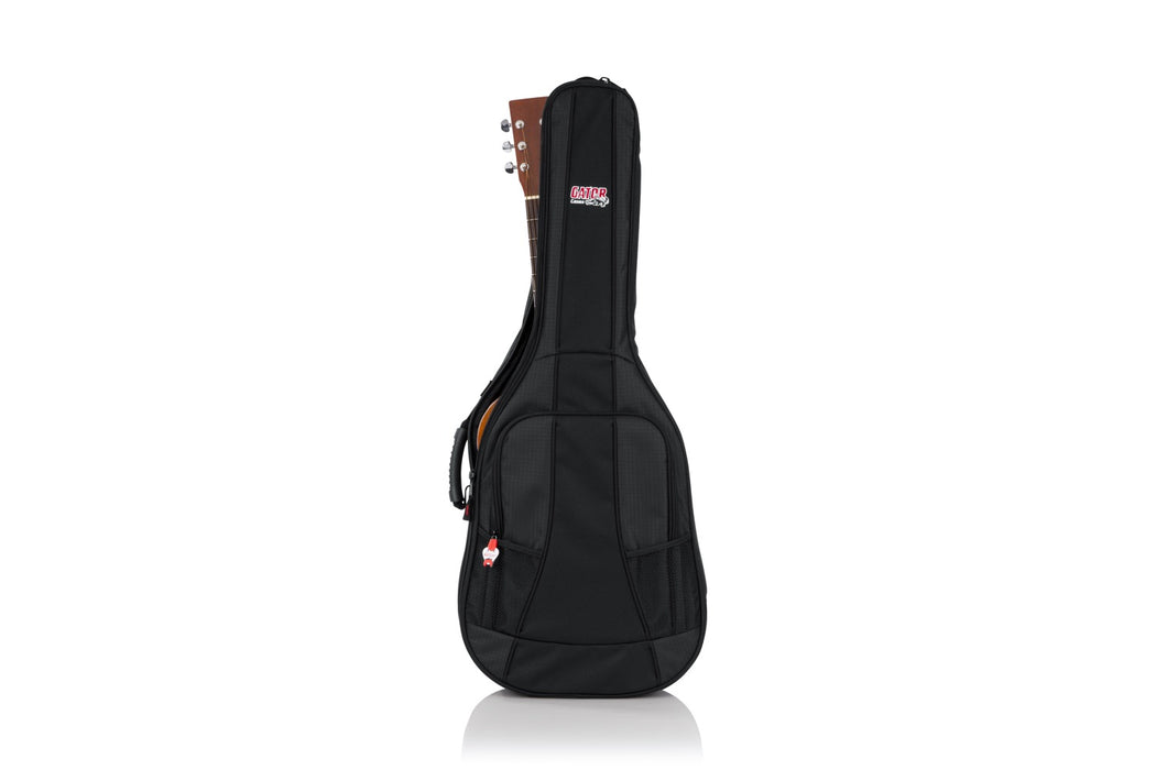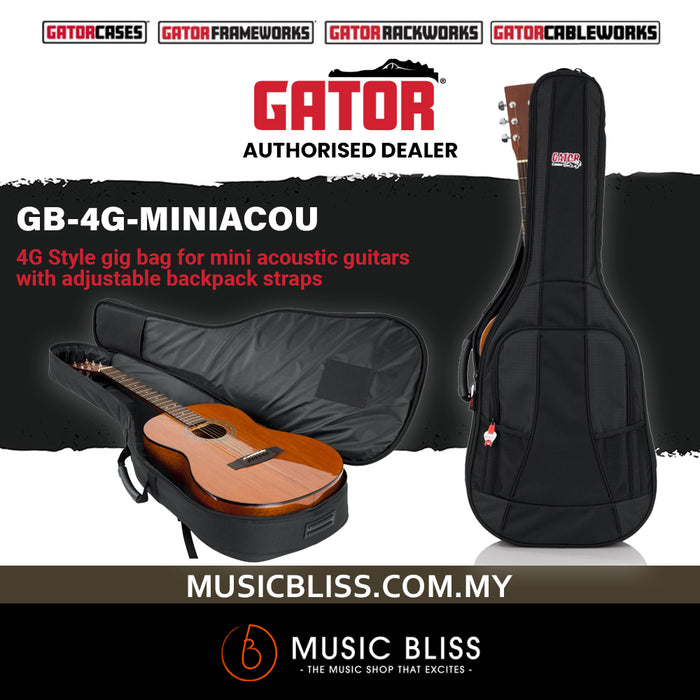 The GB-4G-MINIACOU from Gator Cases is a 4G Style padded gig bag designed for mini acoustic guitars such as the Baby Taylor and Martin LX. The bag features GFLEX 20mm padding on all sides to keep your instrument safe during transport. The headstock and bridge areas have been reinforced to prevent wear, while the bottom of the case offers additional padding to protect the bottom of the guitar.