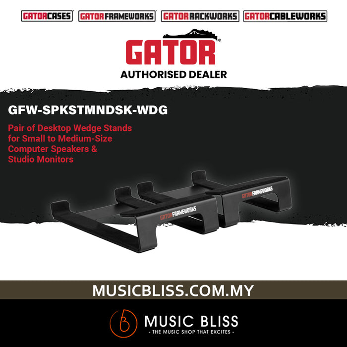 Designed for small-medium desktop-style speakers, these Desktop Studio Monitor Stands from Gator Frameworks improve your listening experience in big ways. They slightly tilt the speakers toward your ears for better sound, plus have a tilt lip to keep the speaker in place on the stand, as well as a non-slip base to keep the stands in place on your listening surface. Their EVA foam padding protects against scratching and provides some sound absorption as well. Before you run out and buy new desktop, bookshelf, or computer speakers, Music Bliss recommends trying out these Desktop Studio Monitor Stands from Gator Frameworks.