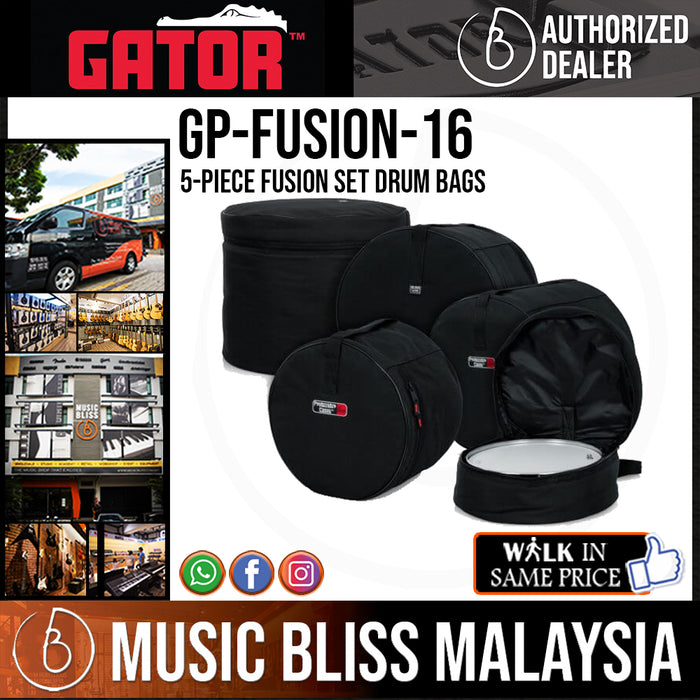 When you use Gator's GP-FUSION16 padded drum bags, you get the protection your drums need plus the lightweight portability you want. Made from tough 600-Denier nylon, each of the five bags included in the GP-FUSION16 set has a padded and lined interior, comfy carrying straps, and heavy-duty zippered closures. You get a snare bag, a bass drum bag, and three sizes of tom bags. And these bags are compact and collapsible, so they won't take up a lot of room. The GP-FUSION16 padded drum bag set lets you transport your drums safely and carry them comfortably!