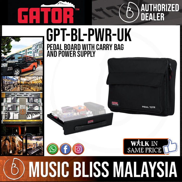 The Gator GPT-BL-PWR-UK is a solidly built plywood pedalboard with a hard wearing tolex covering. The case has access holes for the power cables to keep things tidy ands comes with the Gator G-BUS-8 power supply. The G-BUS-8 has eight 9V outlets and one 18V and includes nine 24 inch power cables. The case comes with a padded gig bag with a large accessory pocket.