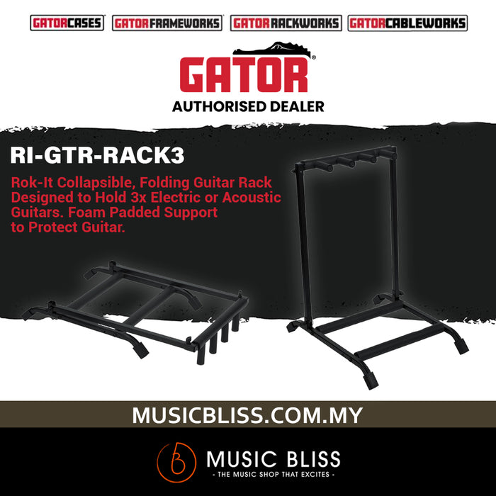 The Gator Cases RI-GTR-RACK3 is a Rok-It Series collapsible stand rack designed to hold up to three guitars or basses, side by side, for musicians and guitar techs in music rooms, shops, studios, and live stage applications. Heavy-duty steel construction ensures durability in a variety of environments. Foam padding protects instruments from dings and scratches at points of contact with the stand. The stand rack can be collapsed and folded for easy transport and storage.