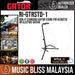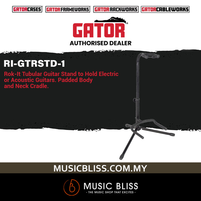 The Gator Cases Rok-It Tripod Guitar Stand is a single tripod stand designed to safely and securely hold your electric or acoustic guitar or bass on the floor in a studio, home, store, or on stage. The heavy-duty metal tube construction provides stability and the black powder-coat finish delivers durability. The neck and body supports feature padding that protects your instrument from scuffs and dings at points of contact with the stand. A neck restraint offers additional security by preventing your guitar or bass from falling forward out of the stand and rubber feet keep the stand from sliding across your floor.