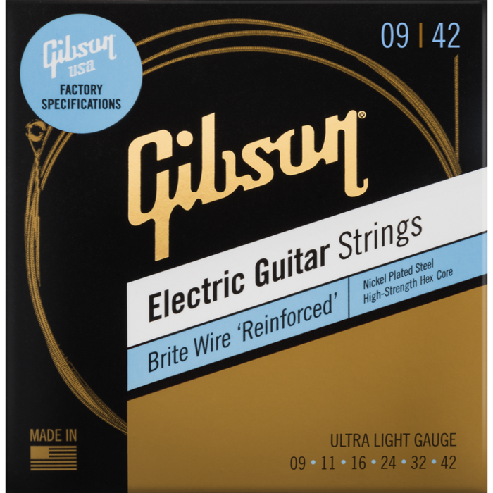 Developed and approved by our Master Luthiers, Gibson Brite Wires are the factory specification strings used at the Gibson USA facility. These strings feature a high-carbon steel, hex-shaped core precision-wound with nickel-plated steel, providing unmatched durability and powerful tone. Discover the superior sustain and bright, crisp attack that is suitable for nearly any playing style.