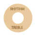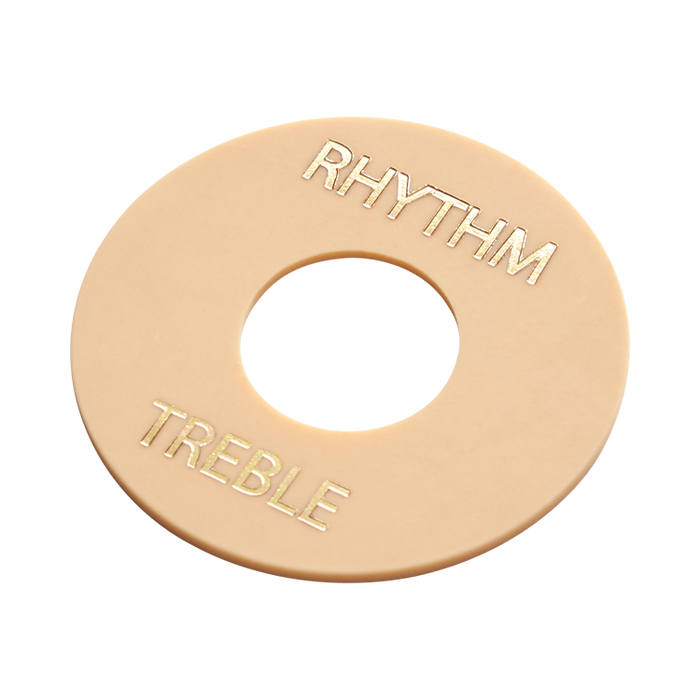 An exact replacement for worn out toggle switch washers, securely fitting over the switch shaft and held in place by the nut. This OEM part is made from ABS plastic and available in either black or crème, both with the gold imprinted letters "RHYTHM" and "TREBLE".