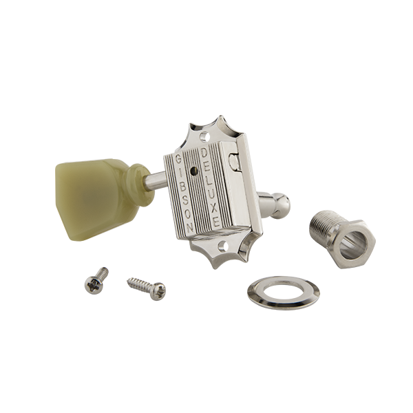 Gibson's vintage machine heads with pearloid buttons feature solid nickel, closed housing construction, period-correct vintage styling, and traditional pearloid buttons that deliver precise tuning, while adding a luxurious, classic feel to your guitar's headstock. This OEM part comes in either Nickel or Gold finish. Special note: These tuners feature screw in bushings, which require a larger diameter mounting hole than traditional 'push in' bushing tuners.