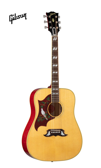 This famous flame maple-backed square-shoulder introduced in the early 60s is intertwined with one of the most revolutionary decades in popular music history. Its maple back and sides and long scale produce crisp, clear tone and projection, while the square-shoulder body adds balance and warmth. Classic Dove™ details include a bone nut and saddle, double antiqued multi-ply binding, nickel Grover® Keystone tuners, a traditional Dove truss rod cover, and a cherished pickguard featuring an inlaid mother-of-pearl Dove with hand-engraved and painted detailing.