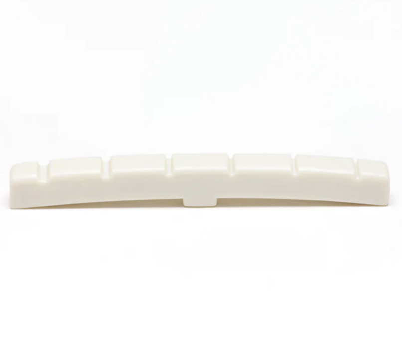 The 5000-L0 is a perfect option to replace and upgrade the nut in almost all Fender-style Left-Handed electric guitars. It will work in both a flat bottom or curved bottom nut slot due to its ingenious design, just sand off the tab for a curved bottom.