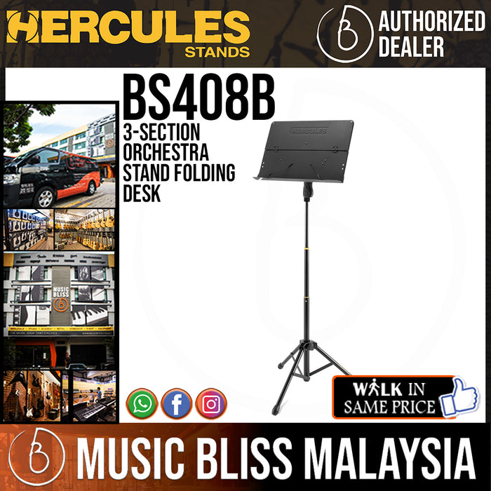 The HERCULES Three-Section Music Stand BS408B features the patented EZ Clutch Height Adjustment Gripa solid folding deska foldable tripod base and wire page retainers.