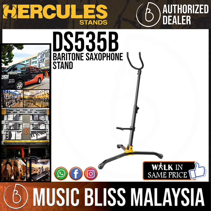 The HERCULES Baritone Saxophone Stand DS535B features the folding yoke, the lever height adjustment, the adjustable backrest, and swivel legs.
