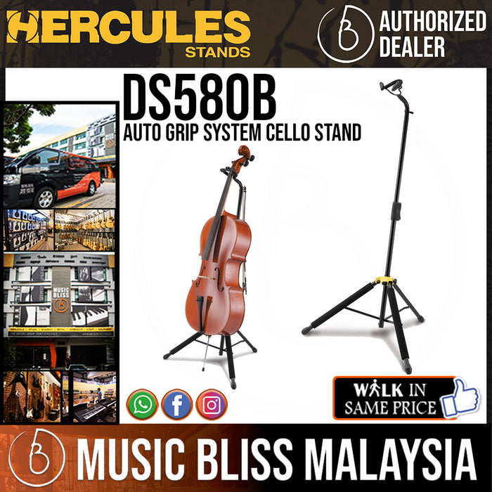 The HERCULES Cello Stand DS580B features the Auto Grip System (AGS) yoke that safely holds the peg box and is equipped with Specially Formulated Foam (SFF) rubber covered legs to protect the instrument at all contact points.