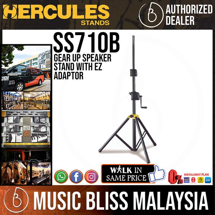 The HERCULES Gear Up Speaker Stand SS710B features the Quick-N-EZ Gear Up System to raise and lower speakers to desired height and securely locks them in place. The SS710BB also features the EZ Adaptor pole top.