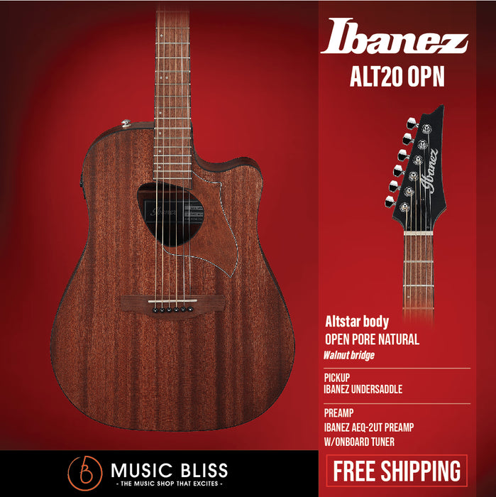 With its thin cutaway body and speedy maple neck, the Ibanez Altstar ALT20 is an acoustic that die-hard electric players will love playing. Plus, given its stunning all-sapele body, artfully shaped pick guard, offset dot inlays, and pointy headstock, this unique acoustic axe is a guaranteed head turner! Unplugged, the ALT20 issues a rich, resonant tone; plugged-in, it retains its natural sound due to Ibanez’s advanced onboard electronics. Moreover, fleet-fingered six-string slingers — ranging from prog rock soloists to bluegrass flatpickers — are sure to appreciate the wickedly flat 15.7-inch fingerboard radius, a favorite feature among technical guitarists at Music Bliss!