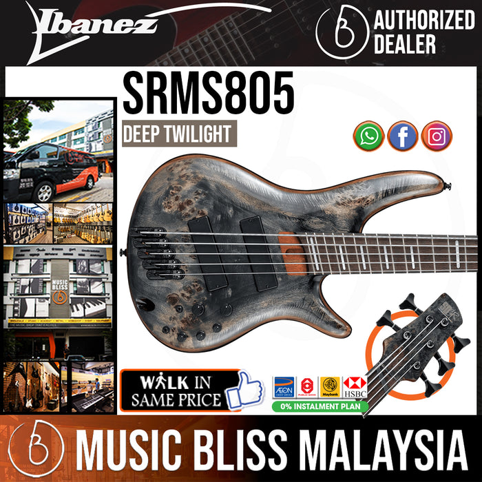 The Ibanez Bass Workshop SRMS805 is built from an exciting blend of tonewoods. A poplar-burl-topped walnut/mahogany body delivers a warm, earthy tone with a round bottom and bright top end. A 5-piece jatoba/walnut neck makes a fine tonal complement, while supplying excellent comfort and stability. The SRMS805's multi-scale fingerboard offers optimal tension and playability. Experience superior intonation and vibration transference, thanks to a Mono-Rail VS bridge. A duo of Bartolini BH2 dual-coil pickups yields incredible depth and clarity, a 3-band EQ allows for further sonic sculpting, and a 3-way midrange switch rounds out the SRMS805's controls. To top it all off, the Bass Workshop SRMS805 features black matte hardware for a sleek, eye-catching look.