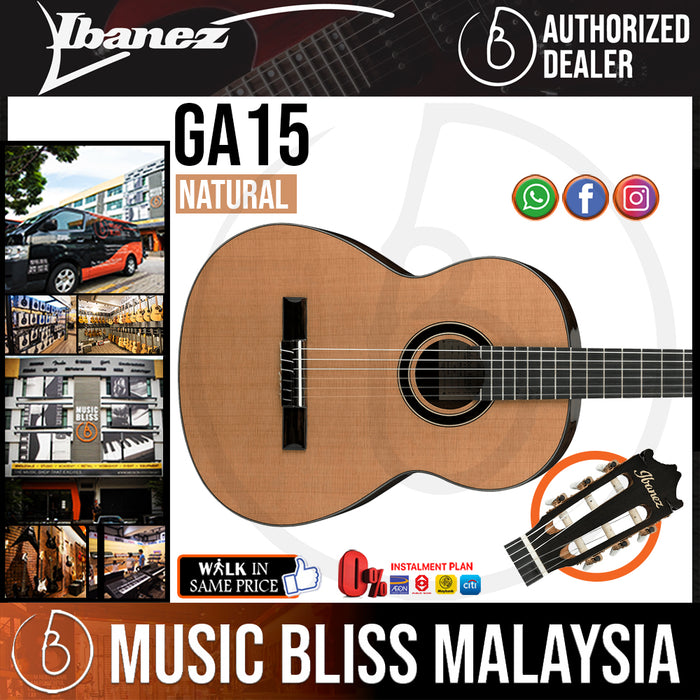 Ibanez classical guitars take the guesswork out of finding an affordable great-sounding classical guitar that easy to fret and play. Whether you are looking for a traditional classical-sized instrument or a comfortable nylon-string beginner guitar they are extremely well-constructed affordable and have the pristine tonality and play ability of much more expensive instruments. The GA15-NT offers up delicious tone with a mixture of cedar top and mahogany back and sides. Stylish appointments include black body binding and a rosewood sound hole rosette which seems to pop off the cedar top.