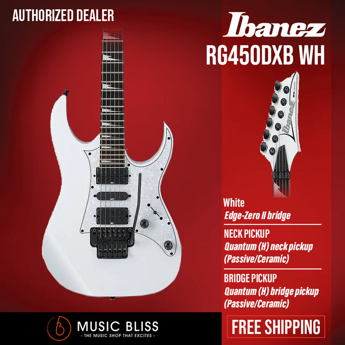 The Ibanez RG450DXB solidbody electric guitar is purpose built for high-speed, low-drag shredding! It all starts with the RG body style, which is primed for players with attitude. The RG450DXB also gives you a fast-playing 3-piece maple Wizard III neck and a resonant, well-balanced meranti body. You'll love how this guitar feels as soon as you pick it up. And it sports two hot humbuckers plus a single-coil in the middle — perfect for rock, blues, and metal. Get your hands on an Ibanez RG450DXB solidbody electric guitar and prepare to shred!