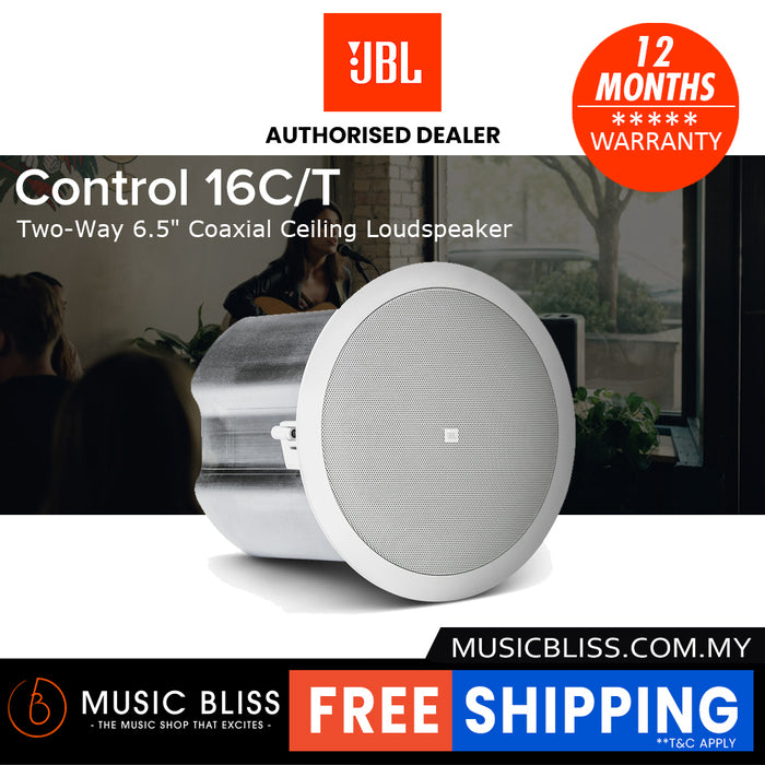 If you're outfitting your office or retail space with a sound system, make it sound great with the JBL Control 16C/T. This 2-way ceiling loudspeaker delivers excellent, full-range sound via a 6.5" high-output low-frequency driver and 0.75" soft-dome liquid-cooled high-frequency driver. Everything is mounted in a vented, paintable baffle that's made of durable, UV-resistant materials. You'll also benefit from easy installation, thanks to a pre-attached blind-mount backcan. At Music Bliss, we've recommended JBL products to studios and performance venues worldwide. That's why we stand behind top-drawer products like the Control 16C/T.