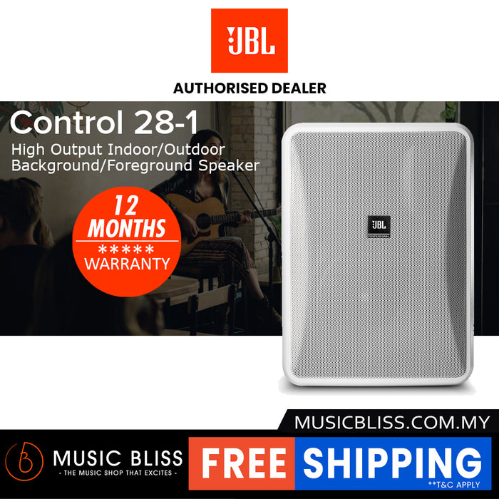 Experience rich sonic character, wide coverage, and broad frequency response with the JBL Control 28-1 high-output speaker. Ideal for retail stores, restaurants, health clubs, theme parks, educational facilities, hospitality, music cafes, leisure venues, and more, the Control 28-1 is a piece of cake to mount, and its contemporary design looks great anywhere. At Music Bliss, we appreciate the versatility of the Control 28-1's built-in InvisiBall mounting hardware. Indoors or out, the weather-resistant JBL Control 28-1 high-output speaker achieves excellent sound quality wherever foreground/background music and/or paging is required.