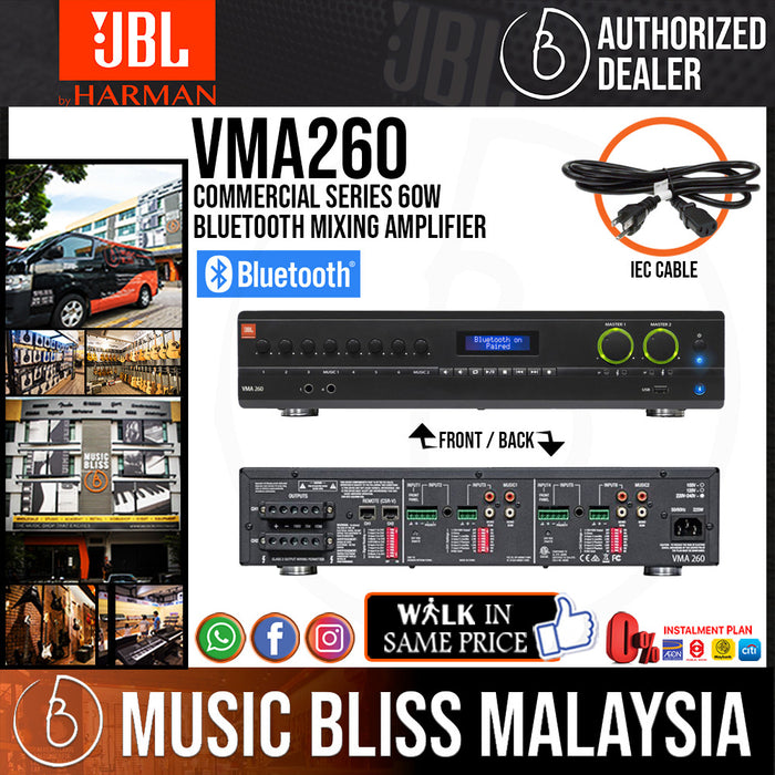 The JBL VMA260 is a Commercial Series Bluetooth-enabled mixer/amplifier designed to provide flexible multi-source mixing and amplification for installation in restaurants, educational institutions, fitness centers, and retail stores. It features an 8-in/2-out mixer and 60W of output power. It can be installed in a standard 19” equipment rack with the supplied rackmount kit or set on a surface such as a desk or ledge. Stream music wirelessly via Bluetooth or connect a USB drive to the front-panel USB Type-A port. Route other sources via Euroblock, RCA, and 1/4" input jacks. The integrated mixer offers level controls as well as bass and treble for each channel. Routing to the Euroblock outputs is configurable. The VMA260 supports voice-activated ducking and priority muting. The front-panel controls and display make operation easy, and remote volume control is possible via a JBL CSR-V module and a standard Ethernet cable (both available separately).