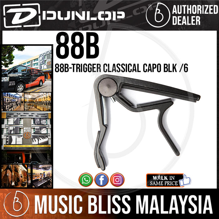 The Jim Dunlop 88B Trigger classical acoustic capo provides positive, accurate clamping for flat fingerboards. Made to provide scratch-free performance for your guitar, the low-profile 88B is designed to stay clear of your fingers. When you need quick key changes without retuning, a quality capo is a must. Dunlop capos are made to do the job right. This unit is constructed of quality aircraft aluminum for reliability and light weight. If you want a great-performing capo that's made to last, choose the Dunlop 88B!