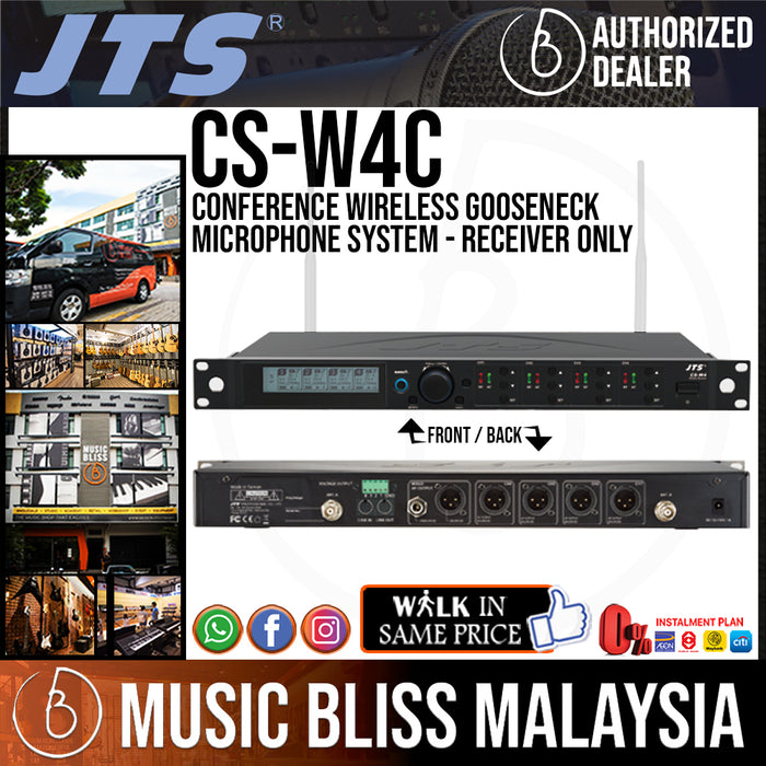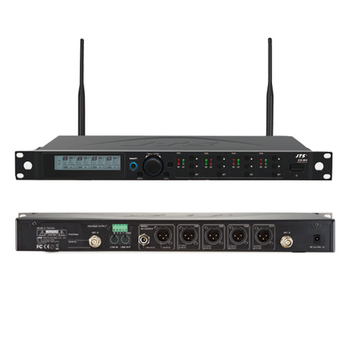 CS-W4C is designed with JTS newest wireless and conferencing technology. It provides maximized compatible channels with a given bandwidth. Built in logic circuit provides conferencing feature. A microphone assigned with priority will work as a chairman unit. It overrides other microphones. Logic setting of one CS-W4C receivers can be cascaded. A microphone with priority in one receiver will also have priority in a cascaded system. JTS patented REMOSET synchronizes all four microphones is of 108 MHz bandwidth. This feature allows more attendants to join the conference.