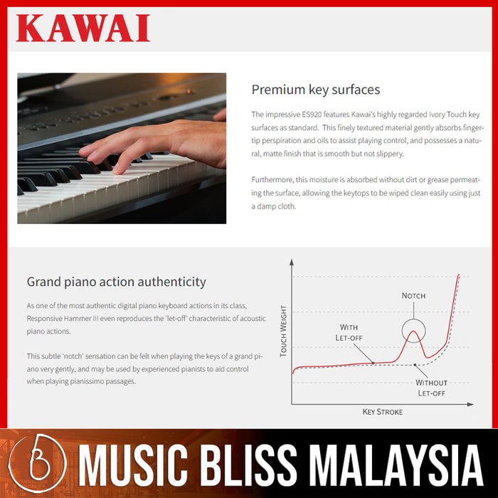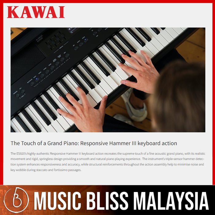Featuring the highly-regarded Responsive Hammer III keyboard action, expressive Harmonic Imaging XL sound technology, a powerful 40W speaker system, and full Bluetooth® connectivity, the impressive ES920 delivers concert grand piano touch and tone, and a selection of excellent instrument sounds, within a stylish, portable package for the home, studio, or stage.