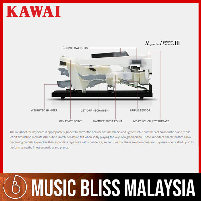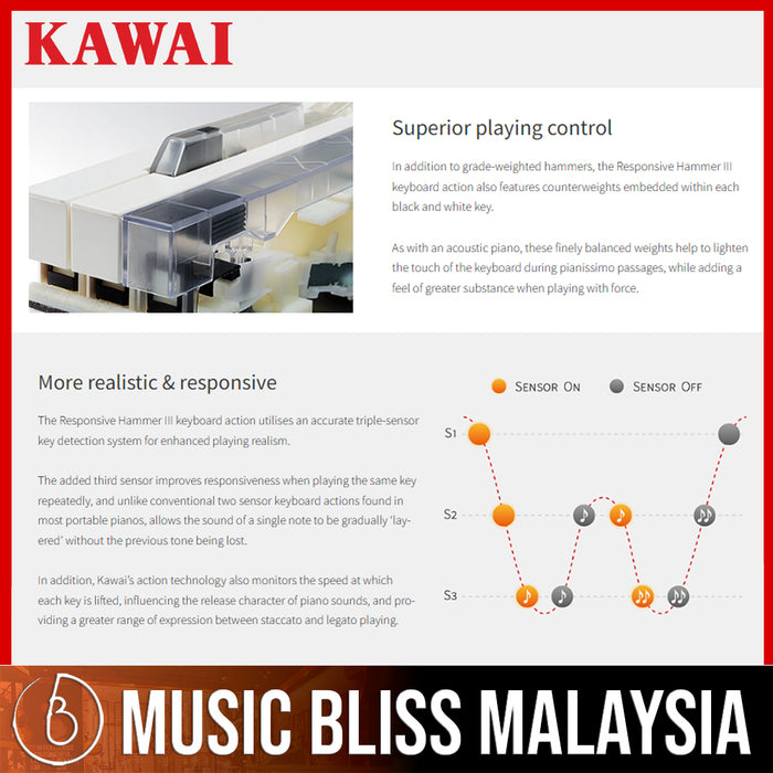 ・ Responsive Hammer III action - 88 keys - Grade-weighted hammers - Ivory Touch white key surfaces - Let-off simulation - Triple sensor key detection - Counterweights |