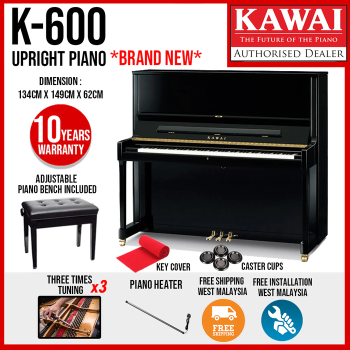 - Free Delivery & Installation included at Ground Floor level Only in West Malaysia - Additional charges apply for deliveries to upper floors. - Free 3 Times Piano Tuning - Free Piano Heater - Free 1 Set Caster Cup - Free Piano Dust Cover - Free Kawai Piano Polish - Free Metronome - Piano Key Cover Included - Adjustable Piano Bench Included - 10 Years Full Warranty |