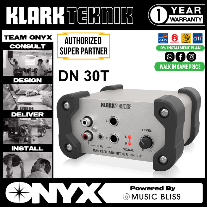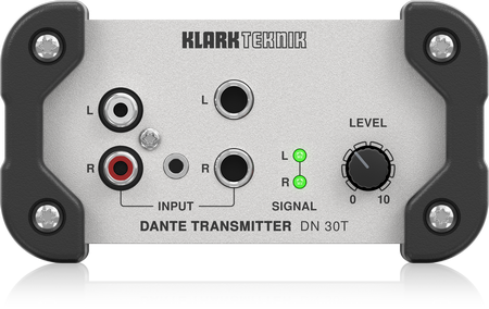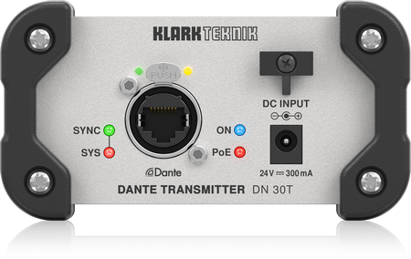 The Klark Teknik DN 30T Dante Audio Transmitter is a simple and convenient way for connecting any mic/instrument or line level source to a Dante network. It’s compact size as well as the flexibility of its features and mounting options make it the perfect networking solution for hospitality and event spaces, performance and installed audio and so much more. The DN 30T can be connected to any Dante receiver via a standard CAT5e or CAT6 cable. This same connection can be used to power the device through Power over Ethernet or via a 24-volt DC input.