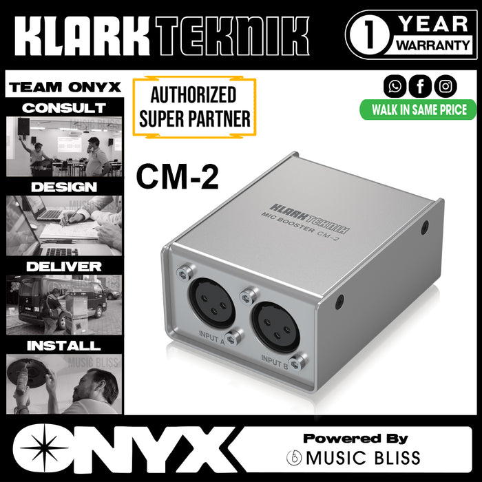 Whenever you need more headroom for any microphone in your podcast, recording studio or stage setup, the MIC BOOSTER CM-2 is exactly the tool you need to get a crisp and clean microphone signal in a robust and simple to use package. Both channels of the CM-2 can work with almost any dynamic or passive ribbon microphone. Its high-quality preamp adds an incredible +25dB of gain to your mic pre’s which increases headroom and allows you to dial in the perfect mic level at a much lower gain setting at the mixer thus leading to a cleaner sound.