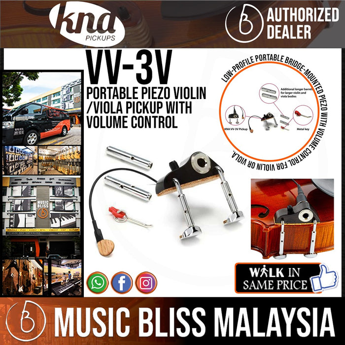 If you've dreamed of plugging your violin or viola into an amplifier without having to drill any holes, then Music Bliss has just the thing for you. The KNA VV-3V offers excellent sound reproduction without the need for any modifications. All you have to do is fit the wood-encased piezo sensor into the eye of the instrument's bridge and mount the output jack to the lower bout — it's that simple! The output jack and volume control are nestled inside an attractive, solid ebony housing that looks great onstage. And since the entire system is passive, it works perfectly with acoustic amplifiers, preamps, and almost anything else. There's never been a more elegant amplification solution for your violin or viola than the KNA VV-3V.