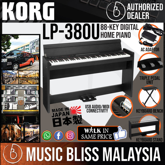 The Korg LP-380-U digital piano is an update of the LP-380-U — a longtime favorite among pianists at Music Bliss — that adds USB Audio/MIDI for easy connectivity to your favorite computer music software. The LP-380-U boasts an advanced soundset with 30 incredible sounds derived from Korg’s flagship keyboard instruments. The LP-380-U employs Korg’s beautifully responsive RH3 (Real Weighted Hammer Action) keyboard, which gives you a heavier feel in the bass register, progressing to a lighter touch in the treble range — just like a real acoustic grand piano. Korg packed the LP-380-U with sophisticated features, including the choice of nine different temperaments to support a wide historical and cultural range of music. And with its sleek, stylish cabinetry, the Korg LP-380-U will grace any room in your home.